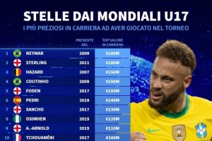 體育資訊11月15日訊 德轉列出了曾參加U17世界杯球員最高身價排名,內馬爾1.8億歐居首,斯特林1.6億歐次席。