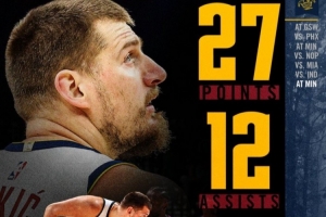 此役,官方數據凍結。掘金官方曬出了約基奇本場比賽數據,27分10籃板12助攻,這是他本賽季第7次三雙。