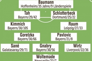 24直播網11月17日訊 《圖片報》預測德國隊世預賽末戰斯洛伐克的首發陣容。鮑曼擔任門將,后防由拜仁和多特球員組成。中場包括格雷茨卡、帕夫洛維奇、薩內、格納布里和維爾茨,鋒線則由沃爾特馬德領銜。此戰將決定德國隊能否晉級歐洲杯。