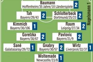 24直播網11月18日訊 德國世預賽末輪主場6-0大勝斯洛伐克,成功晉級世界杯。球員表現亮眼,前鋒沃爾特馬德、主帥納格爾斯曼及薩內、維爾茨獲評1分最高分,鮑曼、格納布里等多人獲2分,替補球員表現亦不俗。