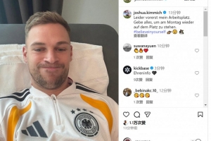 基米希社媒曬出自己在醫(yī)療室的照片,并寫(xiě)道:“遺憾的是這里暫時(shí)成為了我的工作場(chǎng)所,我會(huì)竭盡全力,爭(zhēng)取在下周一(對(duì)陣斯洛伐克)重返賽場(chǎng)。”